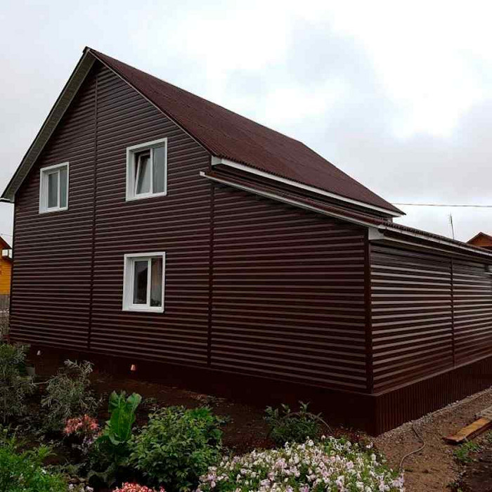 • В отличие от облицовки фасада деревом, металлический сайдинг Корабельная доска прост в монтаже и не требует дополнительного послемонтажного ухода.