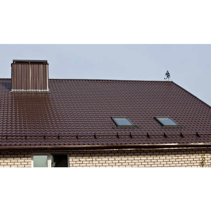 • Кровля защищена от механических воздействий, так как в основе металлочерепицы сталь толщиной 0.45 мм (с учётом металла, цинкового и полимерного слоя).