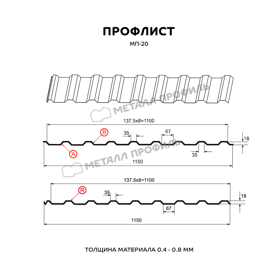 Профлист МП-20 относится к универсальным cтройматериалам. В сравнении с другими модификациями профлиста, этот выпускается в трёх вариациях: А, В и R. Разновидности А и В используются для кровельных работ, облицовки фасадов, монтажа ограждений, для внутренней отделки промышленных зданий, гаражей, ангаров и т.п. Профиль МП-20 с литерой R характеризуется присутствием специального желобка для отвода конденсата и предназначен в качестве кровельного покрытия. В зависимости от области применения, МП-20 изготавливается из оцинкованной стали толщиной от 0,4 до 0,8 мм. Важная деталь: хоть в названии указана цифра 20, на самом деле высота этого профнастила – 18 мм. Он является материалом эконом-класса и имеет доступную стоимость. МП-20 – прочный и долговечный стройматериал, преимущества которого по достоинству ценят не только частные лица, но и крупные застройщики. Он обладает приличной жёсткостью, выдерживает значительные статические нагрузки и эффективно противостоит нагрузкам динамическим.